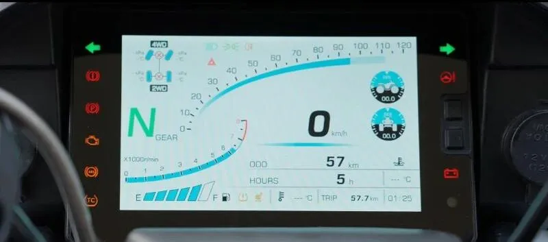 Visualize velocidade, RPM, estado da tração, nível de combustível, temperatura externa e do motor, pressão dos pneus, bússola e clinômetro